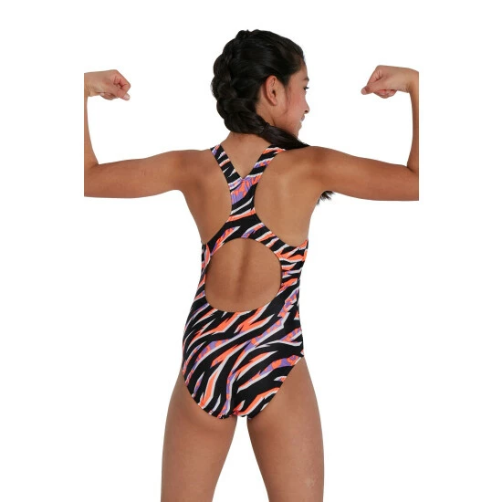 Walk on the wild side wearing this colourful Medalist swimsuit, featuring a striking animal print design. Perfect for training, lessons and beach fun, the medalist style includes back straps that sit between the shoulders of young swimmers, aiding their movement and flexibility. An inner crop top liner ensures your child’s comfort and modesty during their swim. ECO EnduraBrite fabric offers superb colour performance, so you can enjoy the vibrant print for longer. Offering higher chlorine resistance than standard swimwear fabrics, it fits like new for longer with CREORA® HighClo™ and is made from 100% recycled materials.