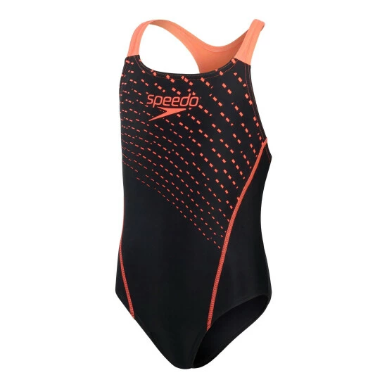 Speedo Essentials everything your child needs for a great swim. Durable and stylish, the Medley Medalist swimsuit features an eye-catching kinetic wave print alongside colour-pop seams and straps. The medalist design is a Speedo classic and aids shoulder movement and flexibility so that young swimmers can cruise through the water without feeling restricted. Ideal for regular pool sessions, our ECO EnduraFlex fabric offers higher chlorine resistance than standard swimwear fabrics and fits like new for longer with CREORA® HighClo . Made from 100% recycled waste fabric, so it s better for the environment too!