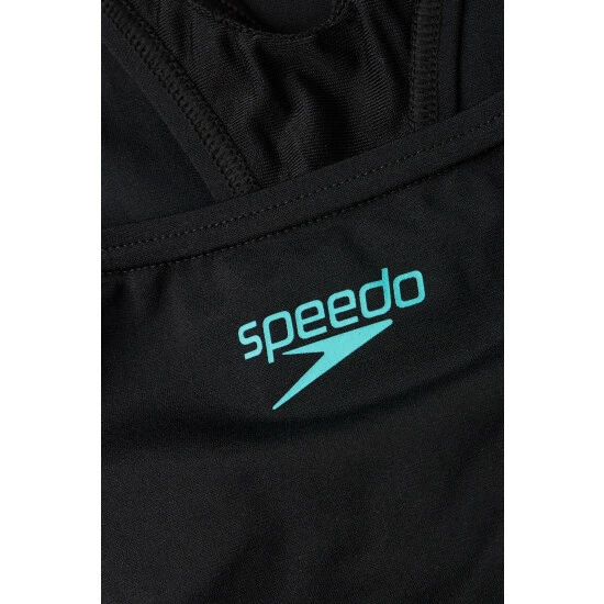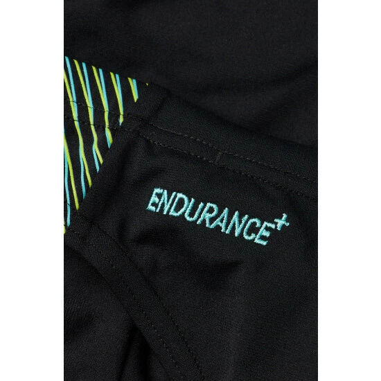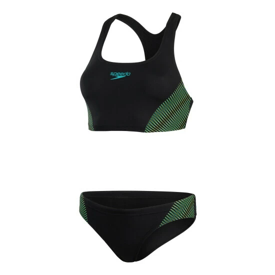 Stylish performance swimwear. This tech-inspired, sporty two-piece features a ribbed-effect graphic spliced design with blue and green. The racerback style allows superb flexibility during your fitness training and the brief includes a drawstring waist, so you feel confident and secure as you move through your workout. Designed to be durable and better for the environment, the two-piece features our new ECO Endurance fabric, which is 100% chlorine resistant, quick-drying and made with 50% recycled materials.